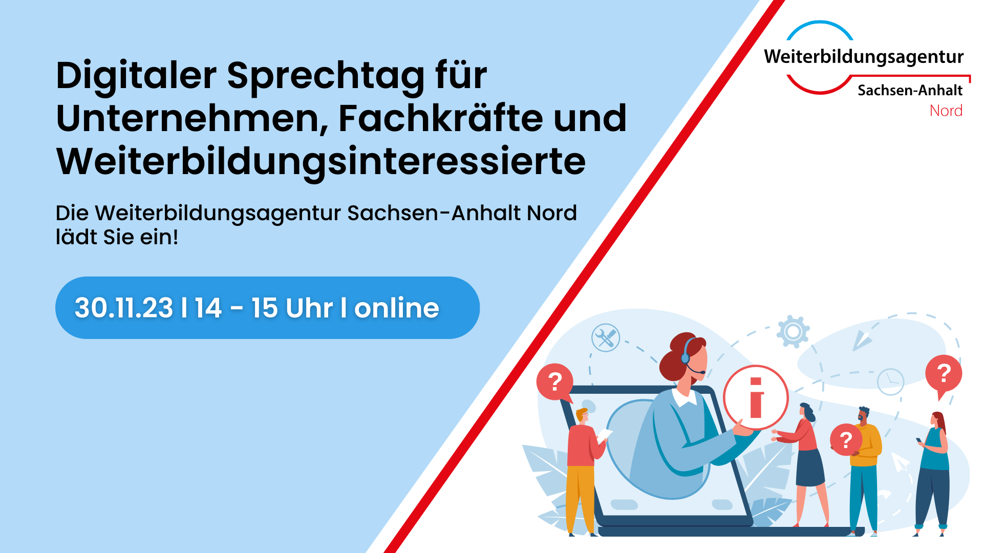 Am 30.11.2023 findet von 14:00 bis 15:00 Uhr der Digitale Sprechtag für Unternehmen, Fachkräfte und Weiterbildungsinteressierte der Weiterbildungsagentur Sachsen-Anhalt Nord statt. An diesem Tag…