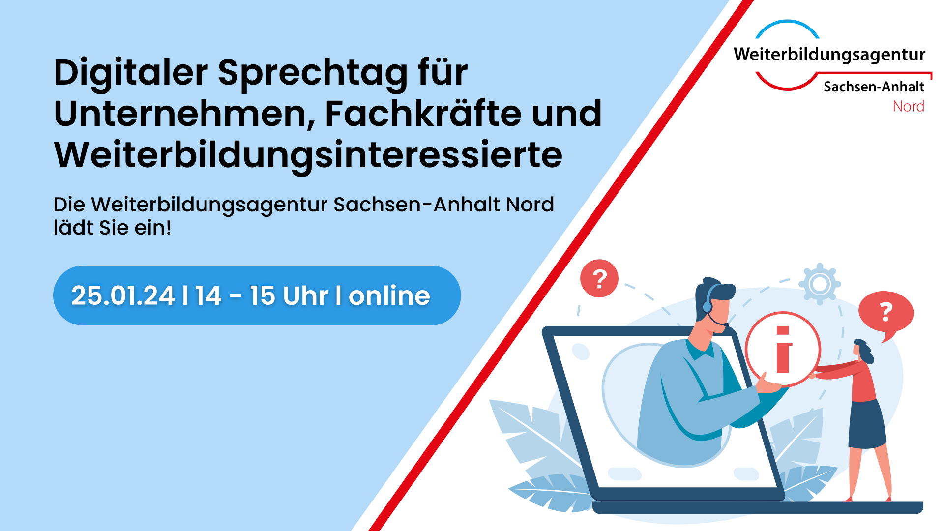 Am 25.01.2023 findet von 14:00 bis 15:00 Uhr der Digitale Sprechtag für Unternehmen, Fachkräfte und Weiterbildungsinteressierte der Weiterbildungsagentur Sachsen-Anhalt Nord statt. An diesem Tag…