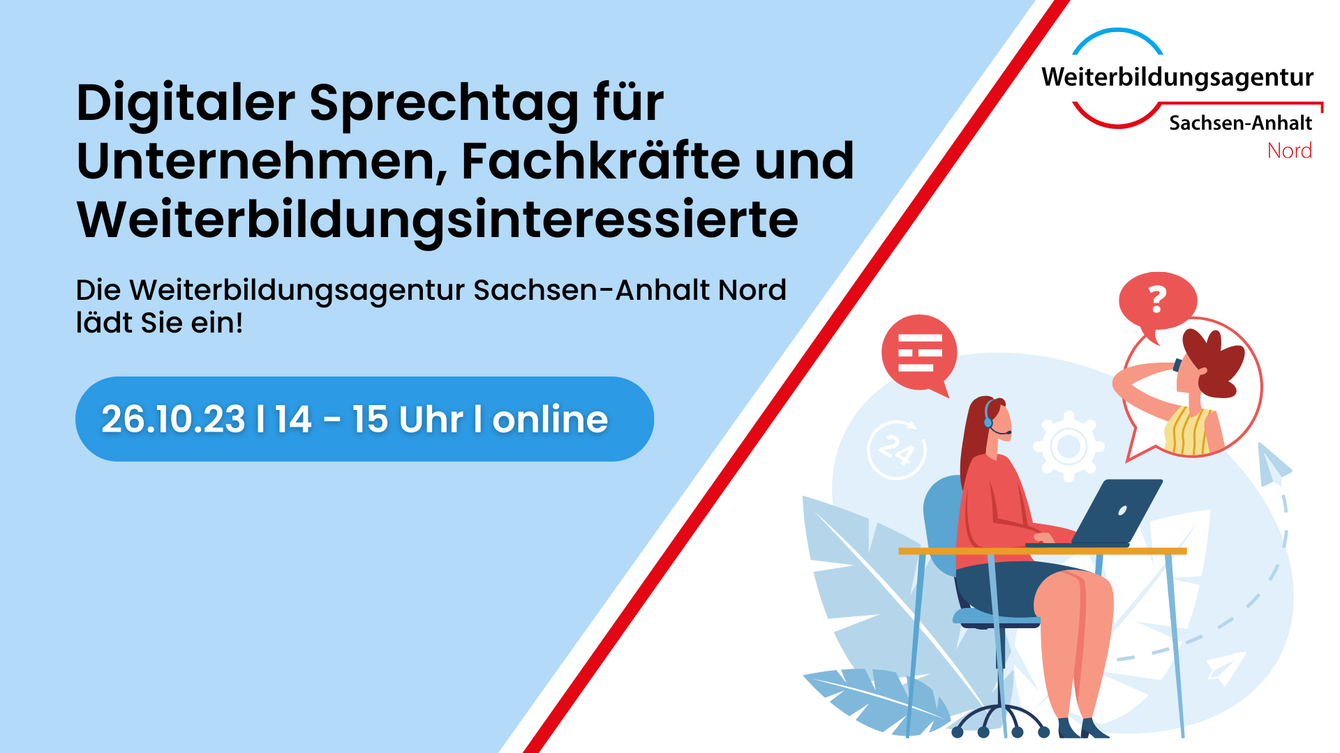 Am 26.10.2023 findet von 14:00 bis 15:00 Uhr der Digitale Sprechtag für Unternehmen, Fachkräfte und Weiterbildungsinteressierte der Weiterbildungsagentur Sachsen-Anhalt Nord statt.